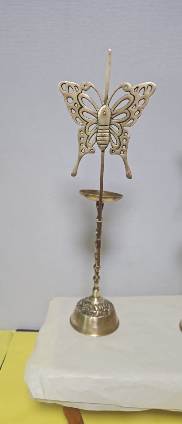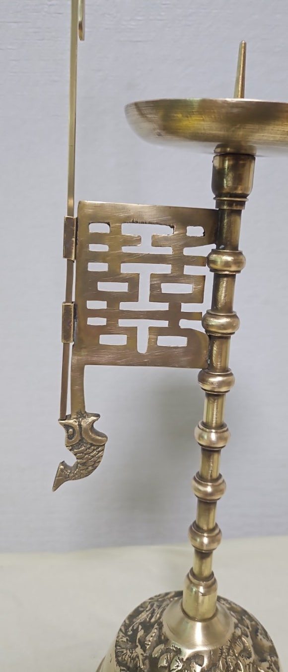 몇 십년 전에 만들어진 방짜유기 놋쇠 촛대 입니다 나비 와 쌍희자 문양이 바람막이로 매달려 있어 운치와 멋을 물씬 풍겨 주며 죽절문이 멋스럽고 부잣집에서 주로 사용하던 것으로 상당히 귀하게 여기던 투각 희자문 나비 촛대 입니다 길상문 명문이 고급스러움을 잘 느끼게 해주고 있고